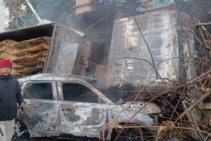 मोहब्बेवाला चौक पर बड़ा हादसा, ट्रक कार पर पलटा; आग से मची अफरातफरी