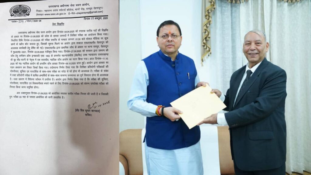 देहरादून. उत्तराखण्ड अधीनस्थ सेवा चयन आयोग द्वारा 21 सितंबर, 2025 को आयोजित प्रतियोगी परीक्षा में कथित अनियमितताओं की जांच के लिए राज्य सरकार द्वारा गठित एकल सदस्यीय जांच आयोग ने आज मुख्यमंत्री पुष्कर सिंह धामी से भेंट कर अंतरिम रिपोर्ट प्रस्तुत की. आयोग की अध्यक्षता न्यायमूर्ति (सेवानिवृत्त) यू.सी. ध्यानी द्वारा की गई.